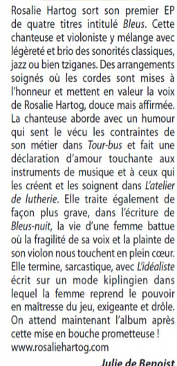 “Né d’une nécessité à transmettre ses expériences de vie sublimées, Rosalie Hartog et sa voix sur le fil, nous parle avec ses cordes frottées, pincées et soufflées, de nos zones de turbulences comme un papillon au milieu des bombes viserait le soleil à l’horizon. Rosalie Hartog a mûri ce projet dans un long processus de création, en parallèle à ses activités de violoniste pour d’autres groupes d’univers très différents. D’abord influencé par le Bill Frisell quartet, Chopin, Loyko et Brel, son travail mélange les genres, du jazz au classique, du tzigane à la musique populaire, accompagnée de musiciens tout terrain. C’est en 2017 que cette aventure commence sur scène, puis en 2018, leur 1er EP « Bleus » sort chez Inouïe Distribution”.